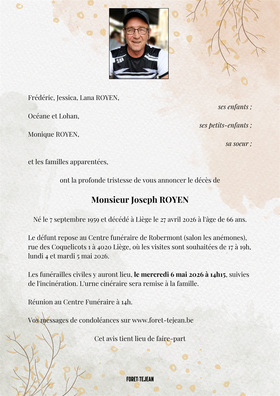 Décédé à Liège (4000) le lundi 27 avril 2026 à l'âge de 66 ans