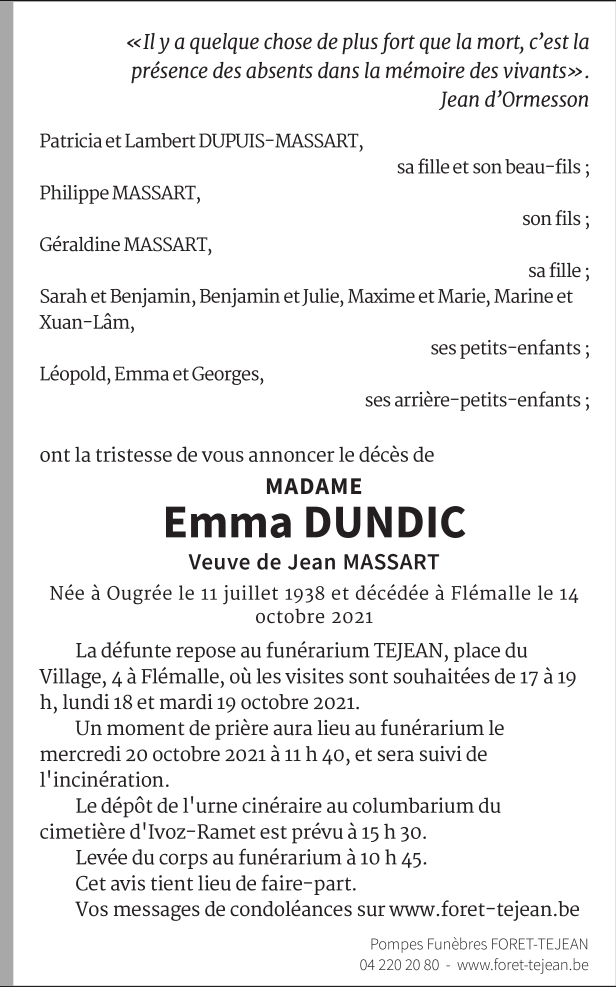 Décédée à Flémalle (4400) le jeudi 14 octobre 2021 à l'âge de 83 ans