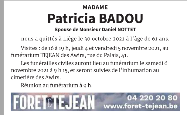 Décédée à Liège (4000) le samedi 30 octobre 2021 à l'âge de 61 ans