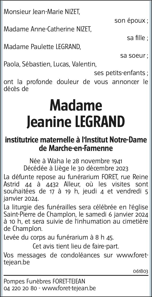 Née à Waha (6900) le vendredi 28 novembre 1941
