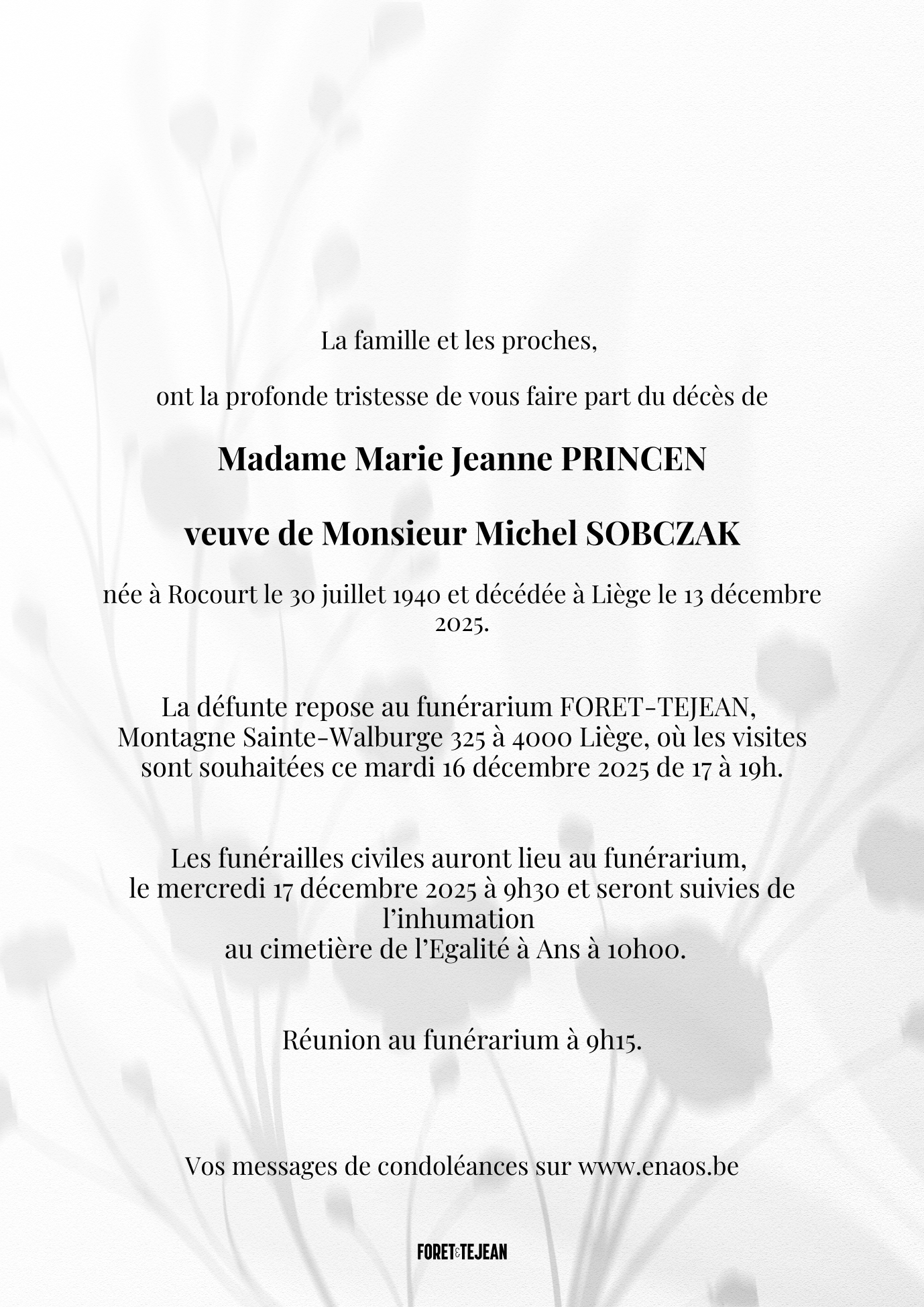 Décédée à Liège (4000) le samedi 13 décembre 2025 à l'âge de 85 ans