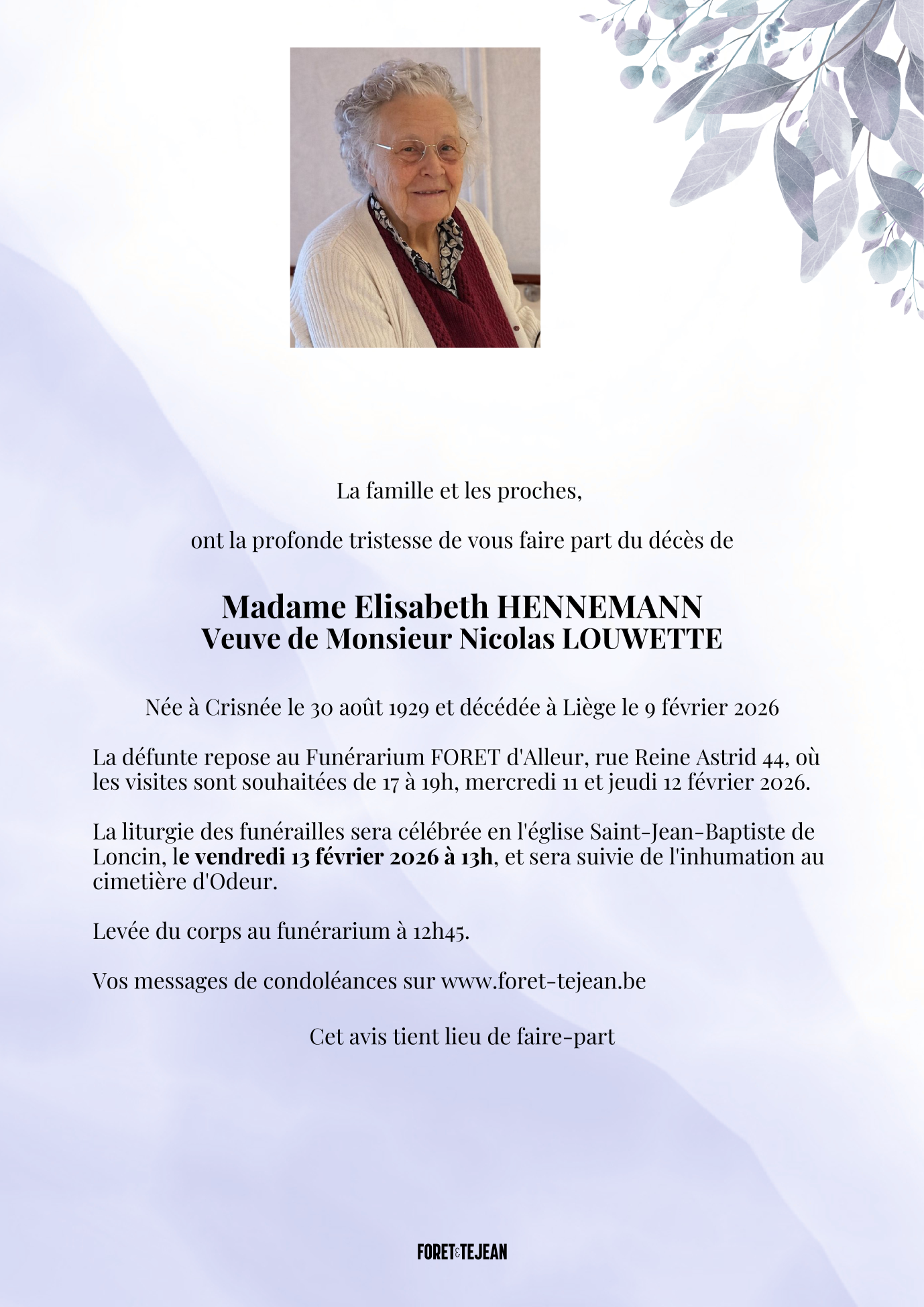 Décédée à Liège (4000) le lundi 9 février 2026 à l'âge de 96 ans