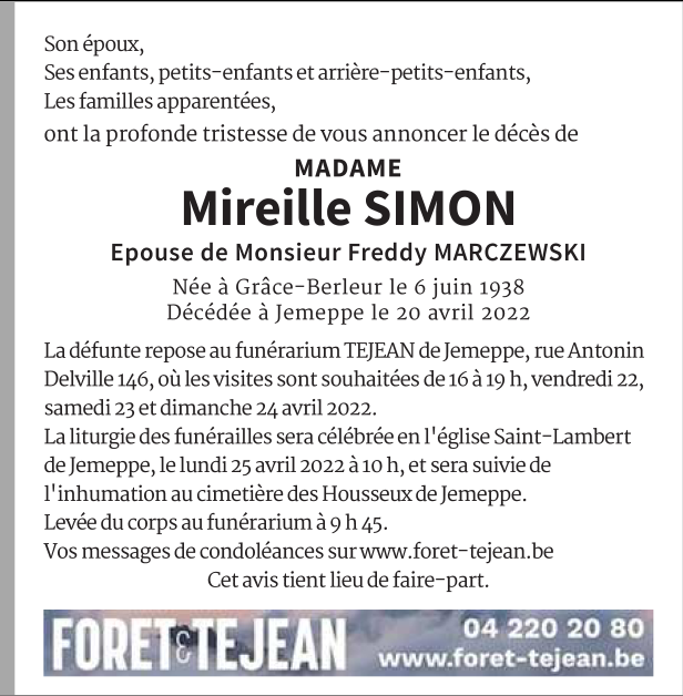 Décédée à Jemeppe-sur-Meuse (4101) le mercredi 20 avril 2022 à l'âge de 83 ans