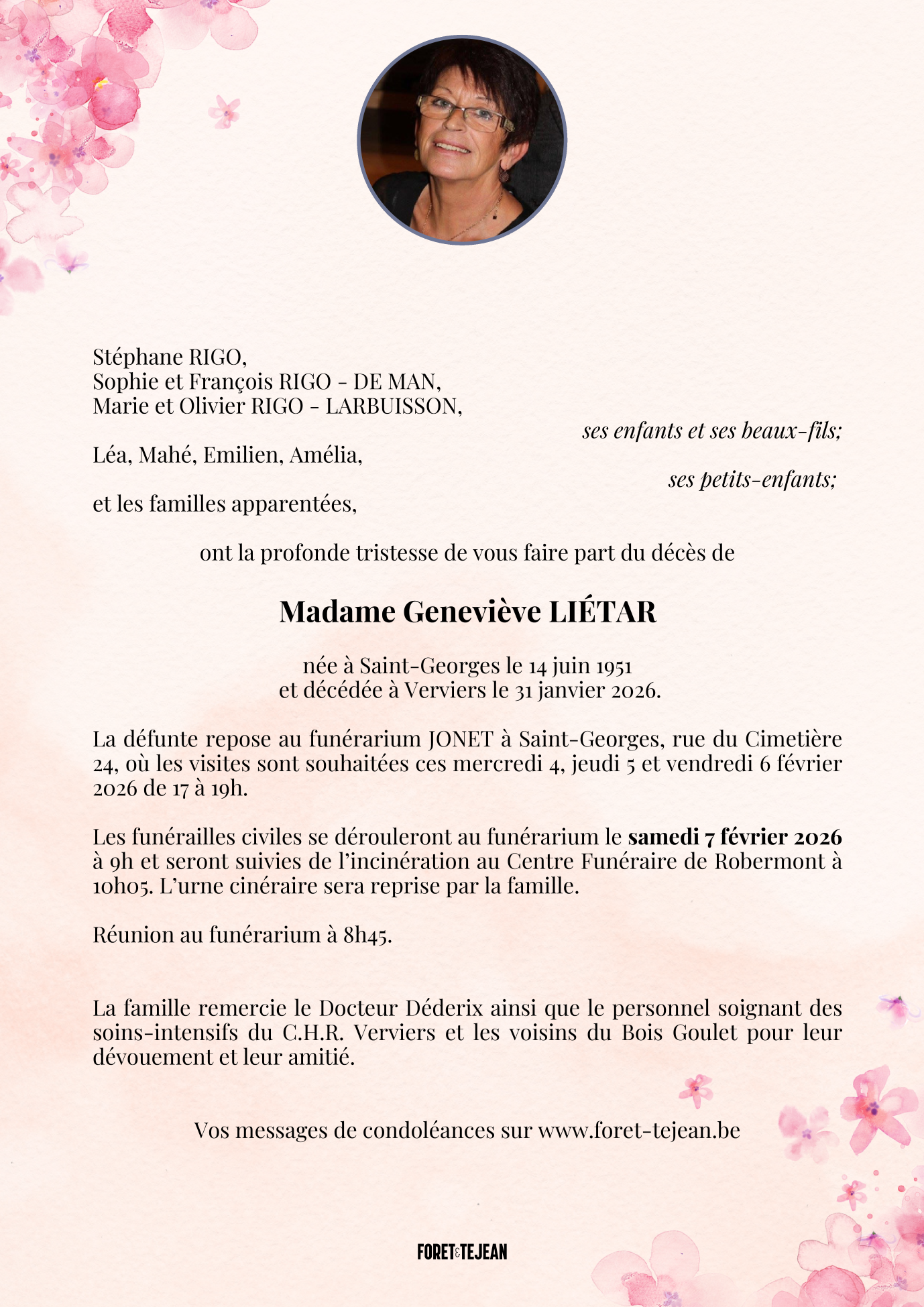 Décédée à Verviers (4800) le samedi 31 janvier 2026 à l'âge de 74 ans