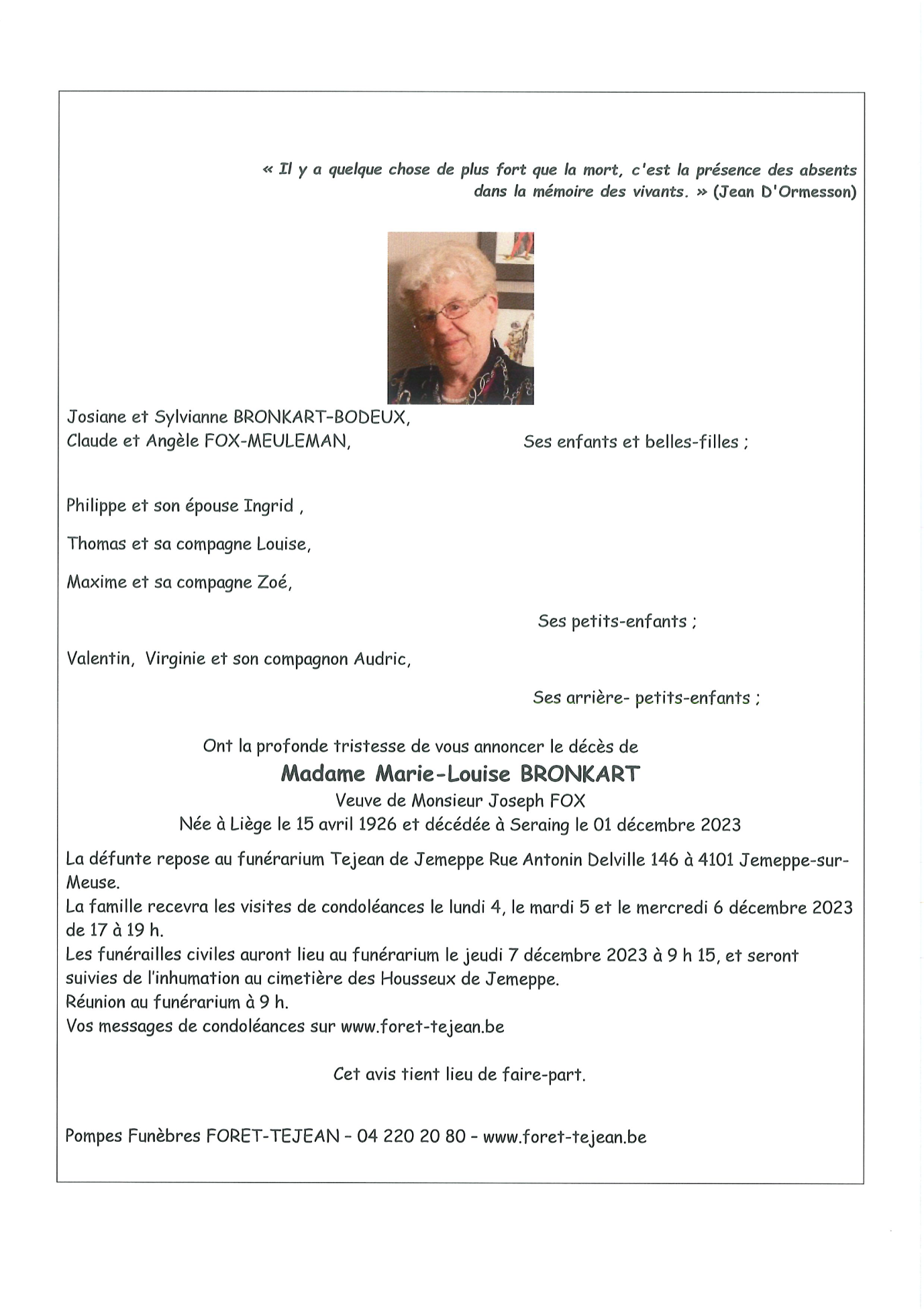Décédée à Seraing (4100) le vendredi 1 décembre 2023 à l'âge de 97 ans