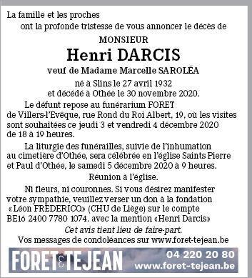 Décédé à Othée (4340) le lundi 30 novembre 2020 à l'âge de 88 ans