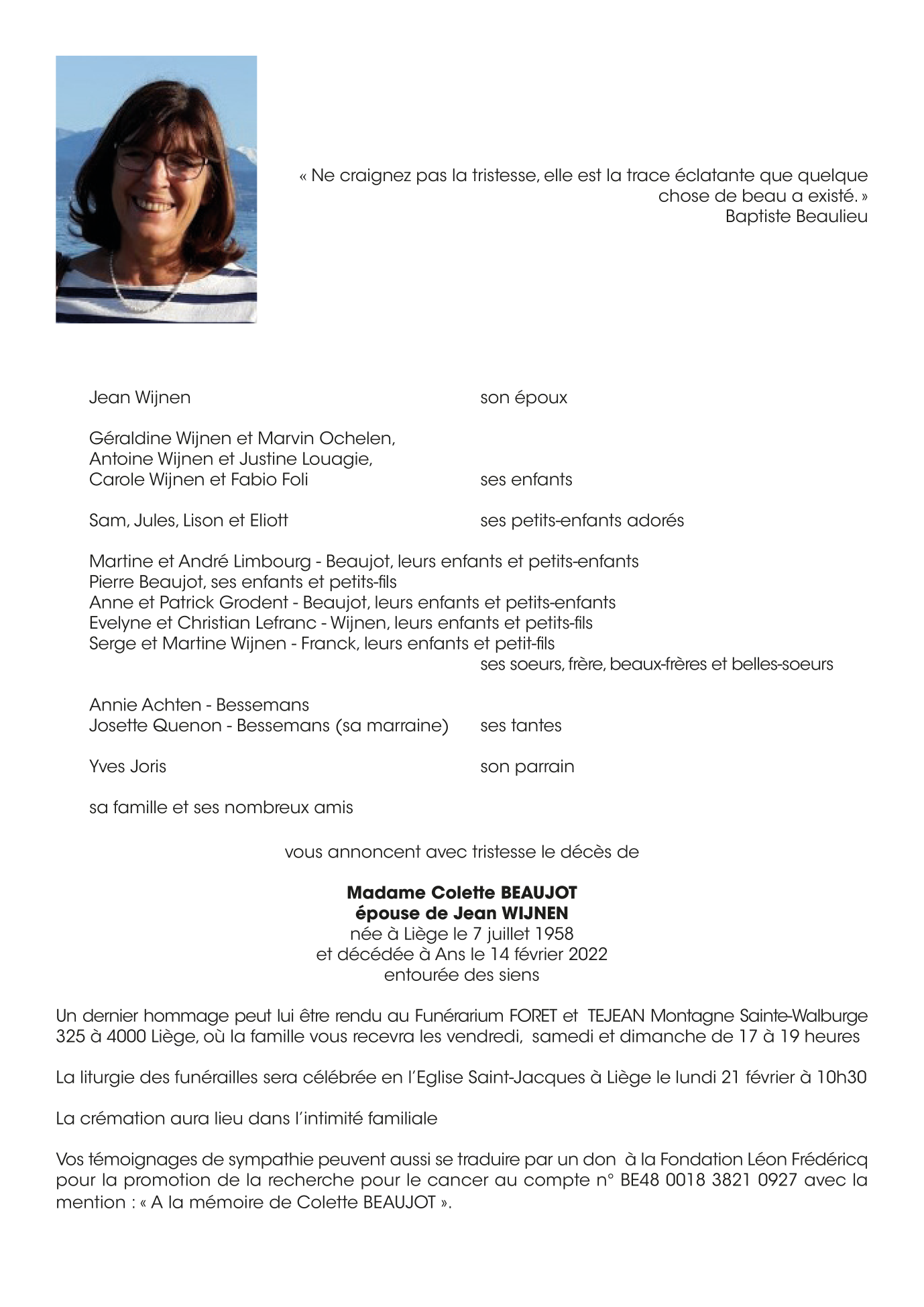 Décédée à Ans (4430) le lundi 14 février 2022 à l'âge de 63 ans