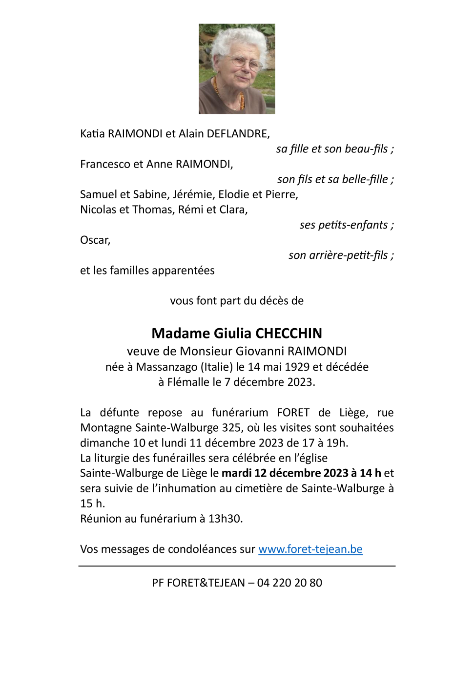 Décédée à Ivoz-Ramet (4400) le jeudi 7 décembre 2023 à l'âge de 94 ans