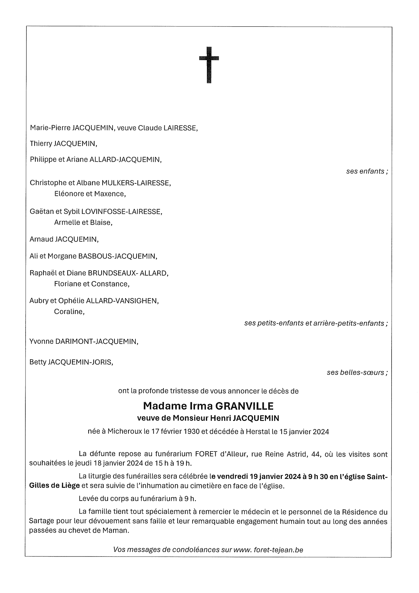 Décédée à Herstal (4040) le lundi 15 janvier 2024 à l'âge de 93 ans