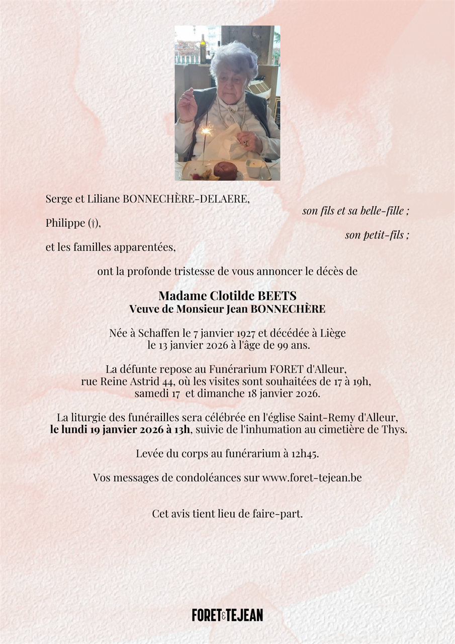 Décédée à Liège (4000) le mardi 13 janvier 2026 à l'âge de 99 ans